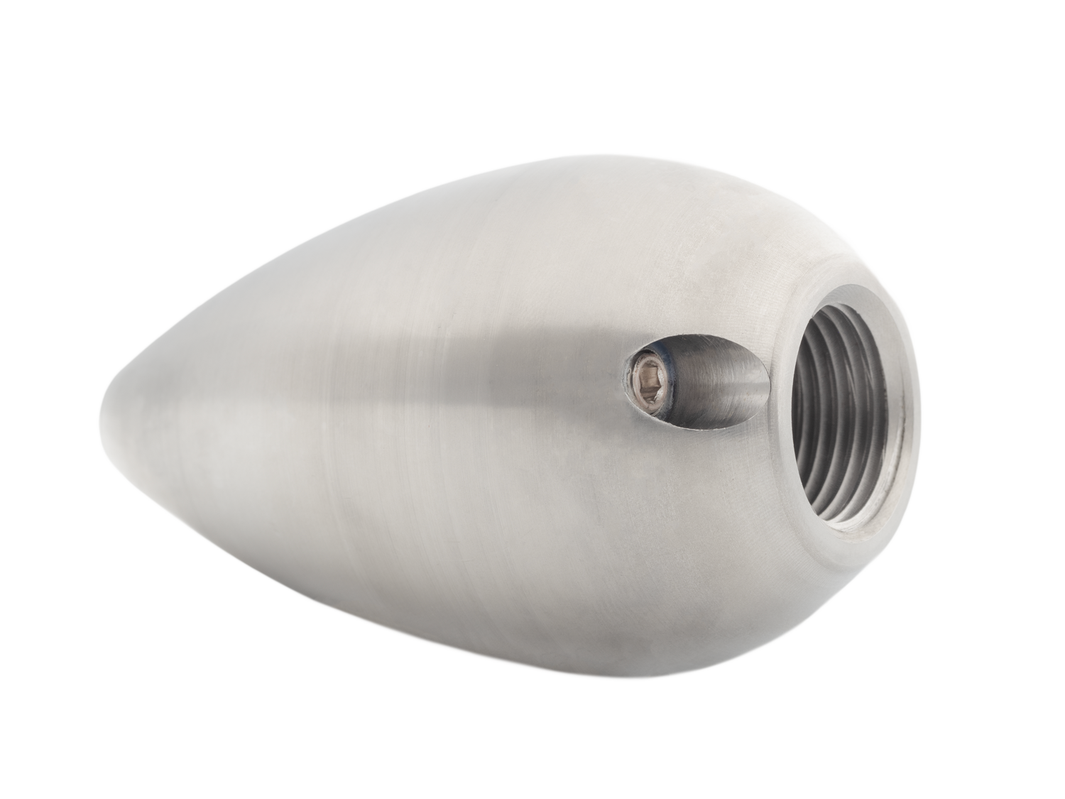 This nozzle is made of stainless steel, ensuring durability and corrosion resistance. The Bullet 1/2” is equipped with a 1/2” thread, making it compatible with a wide range of high-pressure hoses. Its conical design allows effective cleaning in pipes with diameters from 4” to 10” inches.