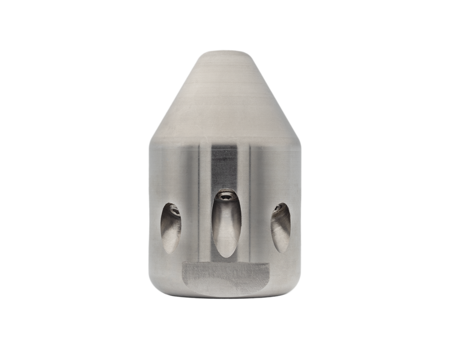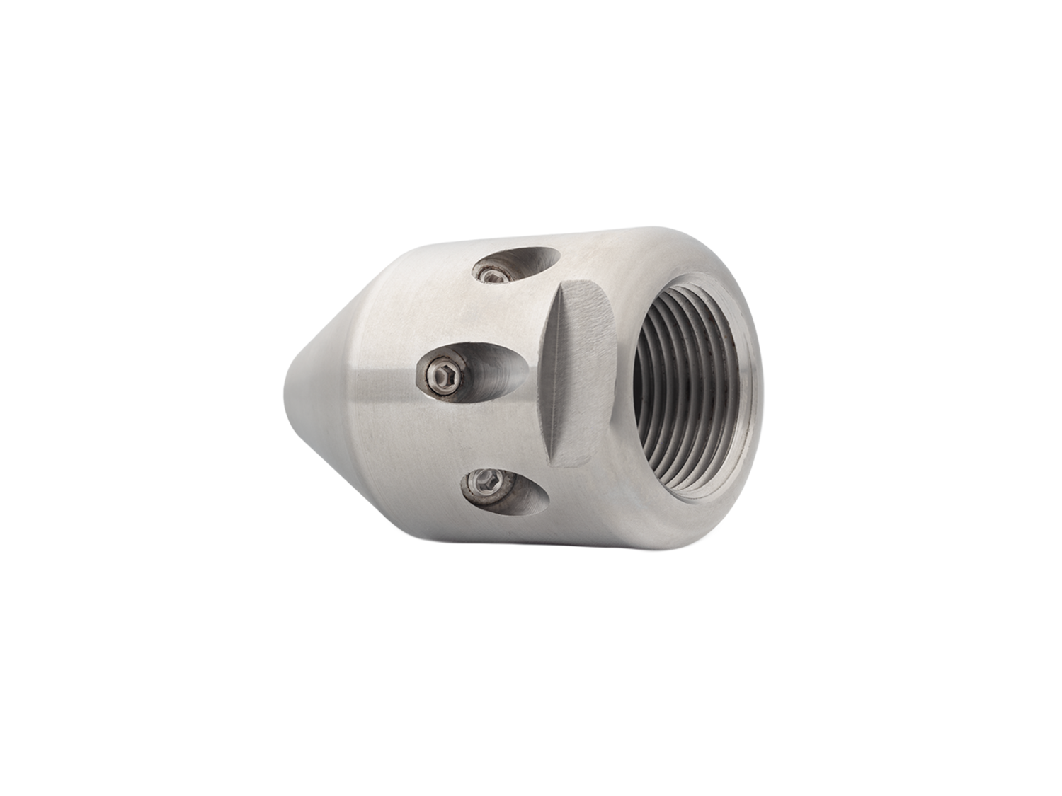 Nozzle designed for pipe cleaning. Made of stainless steel, it offers durability and resistance. Available in three sizes, it effectively cleans pipes from 8″ to 16″ with 15º-30º rear jets and an optional front jet.